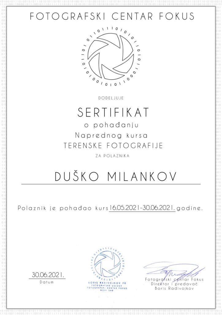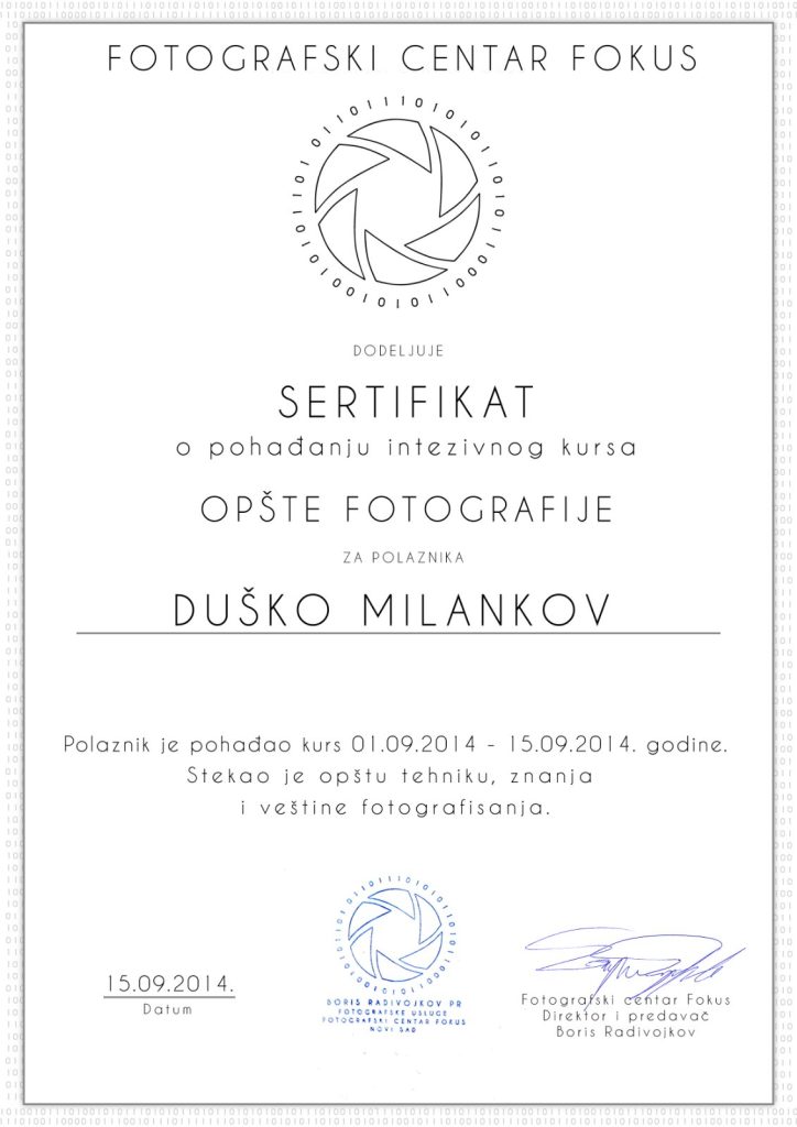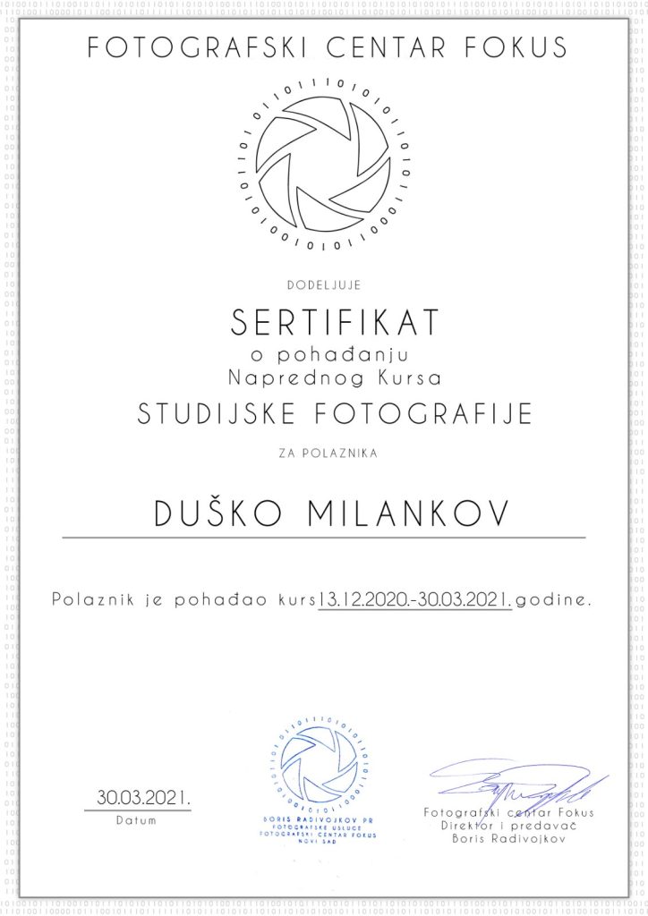 Ja sam Duško Milankov i fotografijom sam počeo da se bavim iz hobija. Ubrzo sam se odlučio da upišem kurs kako bih stekao znanje i veštine, gde sam prošao od početnog, studijskog do terenskog kursa za fotografisanje. Nakon toga sam uzeo profesionalnu opremu i počeo da se bavim fotografisanjem većih događaja. Smatram da je fotografija jedini vid da zamrznete vaše dragocene trenutke i da time sačuvate vaše uspomene kojima možete da se divite i razmenjujete sa prijateljima i familijom kako biste se rado sećali na njih.